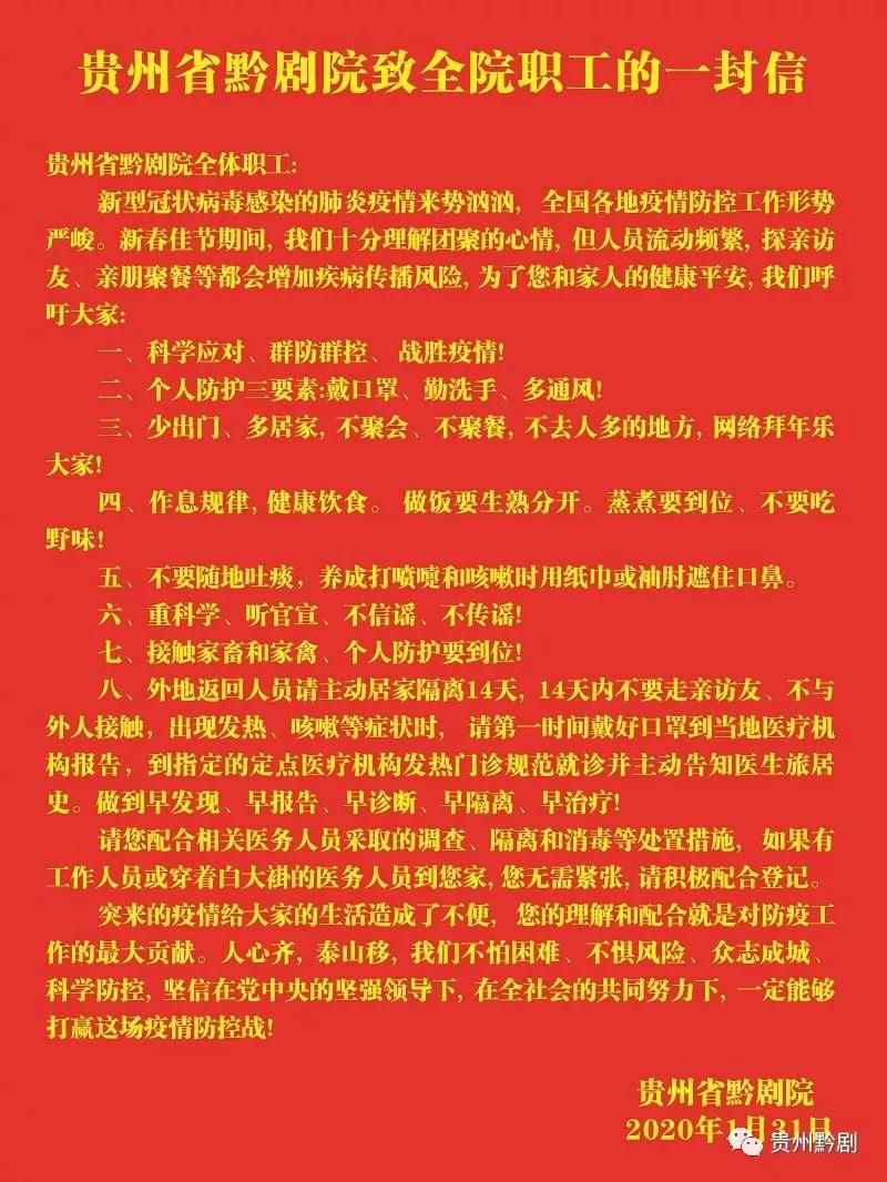 2020,貴州省黔劇院全體職工隨時關注著新型冠狀病毒感染的肺炎疫情,防控感染,抗擊疫情的最新進展,一幕幕感人肺腑的防控畫面牽動著黔劇院每一個人的心。為深入貫徹落實中央和省委、省政府關于堅決打贏疫情防控阻擊戰的決策部署貴州省黔劇院積極響應中央及省委、省政府的號召,于大年初七開始,院領導班子就以電話微信會議、共產黨員干部微信群學習、中層干部會議等形式,布置了我院在這個特殊時期的一系列疫情防控、文件學習、文藝創作的工作安排。