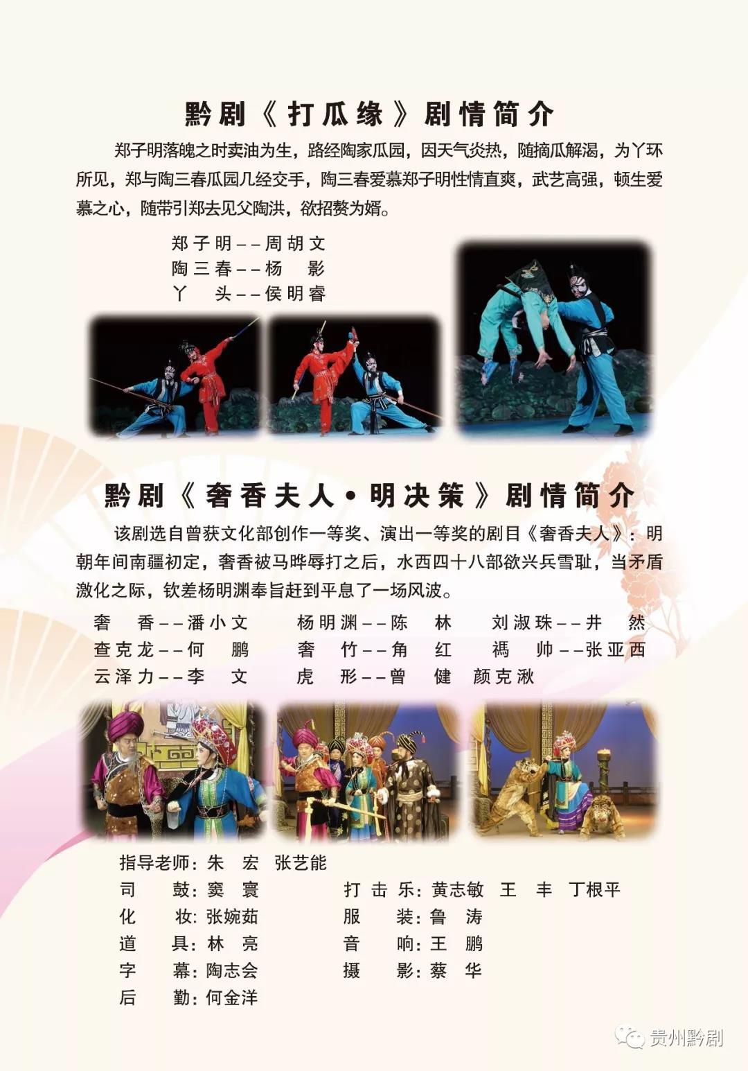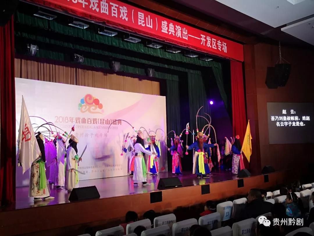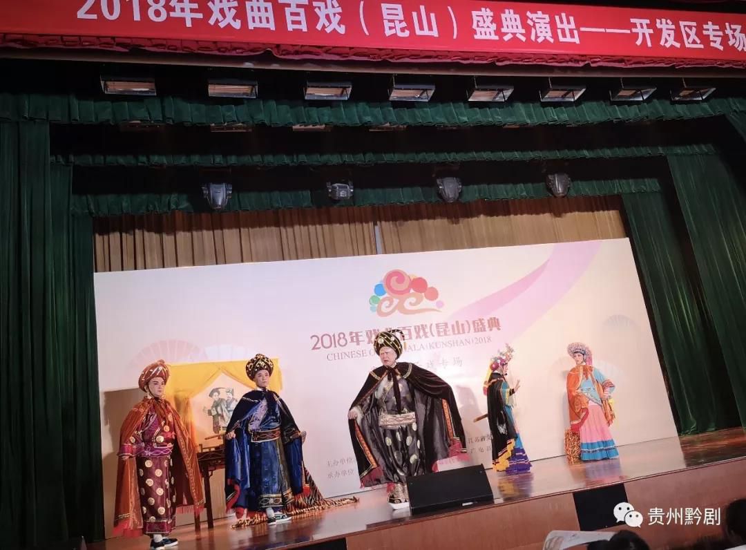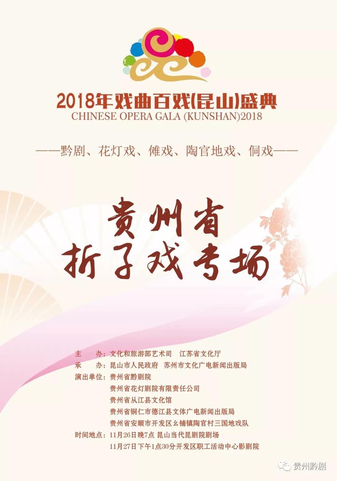 在貴州省文化和旅游廳安排部署下,由貴州省黔劇院攜貴州省花燈劇院、從江縣文化館、銅仁市德江縣文體廣電新聞出版局、安順市開發區幺鋪鎮陶官村三國地戲隊五個單位,黔劇、花燈戲、儺戲、陶官地戲、侗戲五大劇種,代表貴州省于本月25日赴昆山參加“2018年戲曲百戲(昆山)盛典”貴州省折子戲專場演出,分別于26日、27日在昆山演出兩場。