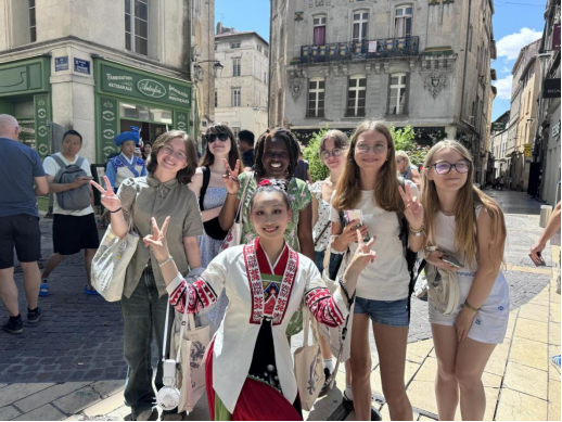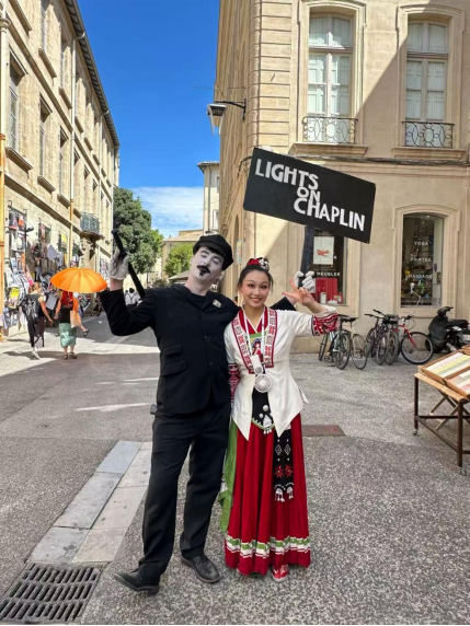 此次我非常有幸能赴法國參加阿維尼翁戲劇節,演出黔劇《秦娘美》,能在這樣多元化且包容性強的藝術氛圍中,進行演出、巡游宣傳活動,展現我們黔劇藝術,是珍貴難忘且非常有意義的一次經歷。踏入阿維尼翁,就看見大街小巷張貼著各個戲劇節作品的海報,以及來自世界各地的藝術家和觀眾匯聚于此,這讓我感受到各國藝術文化帶來的強烈碰撞感。人們已經不滿足于現實生活的溫飽,更追求戲劇藝術、自我精神層面的滿足,藝術從業者們也正努力創作出更多具有思想內涵的藝術作品,使更多觀眾享受不同風格的藝術盛宴。