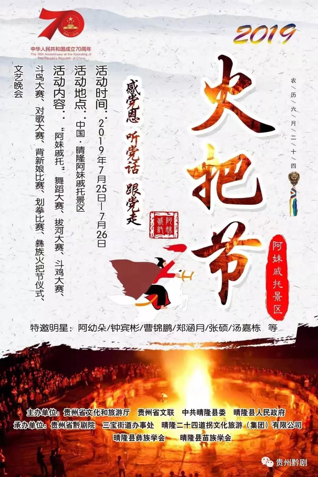 由貴州省文化和旅游廳、貴州省文聯、中共晴隆縣委、晴隆縣人民政府主辦,貴州省黔劇院、三寶街道辦事處、晴隆二十四道拐文化旅游(集團)有限公司、晴隆縣彝族學會、晴隆縣苗族學會承辦的以“感黨恩、聽黨話、跟黨走”為主題的盛大活動——中國·晴隆阿妹戚托景區2019彝族火把節,于2019年7月25日-26日在貴州省晴隆縣阿妹戚托小鎮隆重開幕。