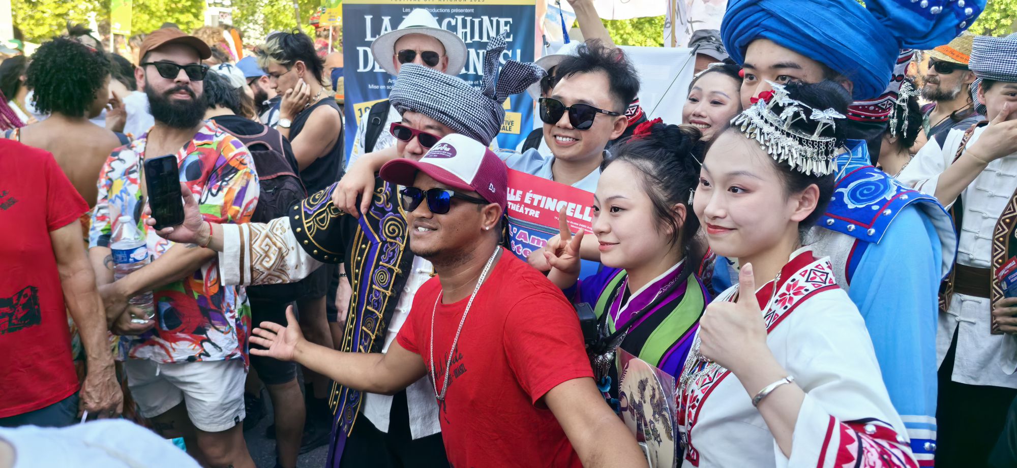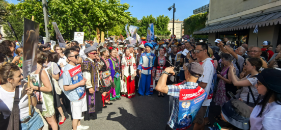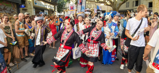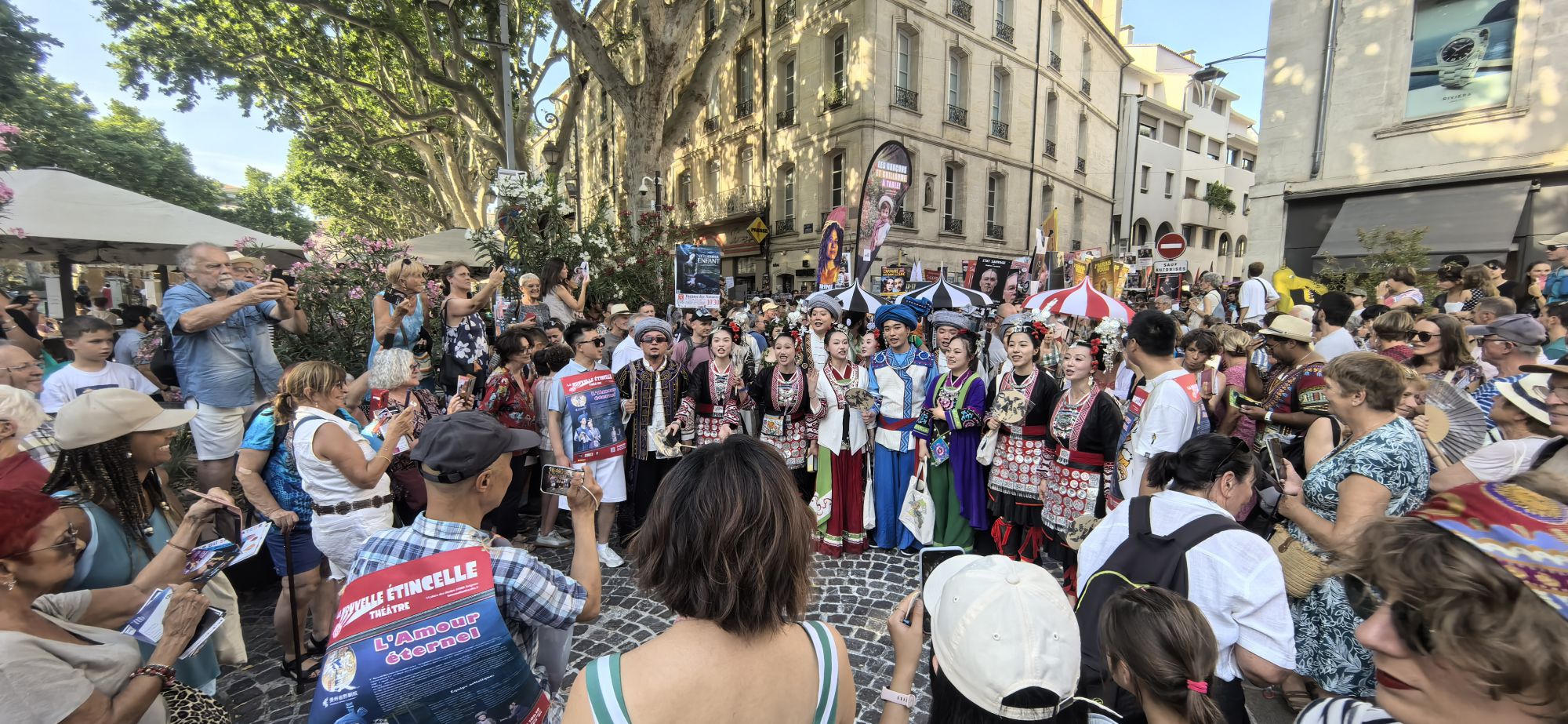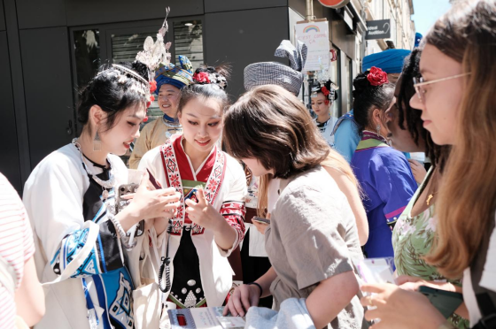 “Qin Niangmei, a love story from Guizhou, China!”完成劇場演出后,黔劇演員們又來到阿維尼翁的街頭掛劇目海報、贈送《秦娘美》文創紀念品,并進行5次具有貴州民族、戲曲元素的快閃表演,將貴州戲曲文化元素,撒向這座中世紀古城的每一個角落。落。