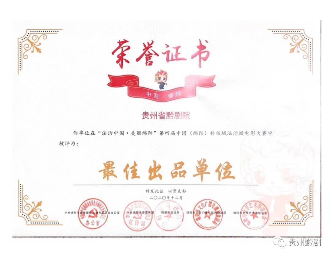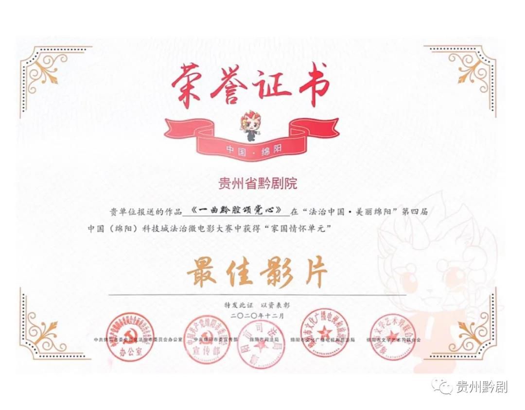 本次大賽以“法治中國·美麗綿陽”為主題面向全國各界開展系列優秀劇本、影視作品征集,貴州省黔劇院出品的微電影《一曲黔腔頌黨心》代表貴州省參賽,并榮獲“家國情懷單元”影片獎和出品單位獎。