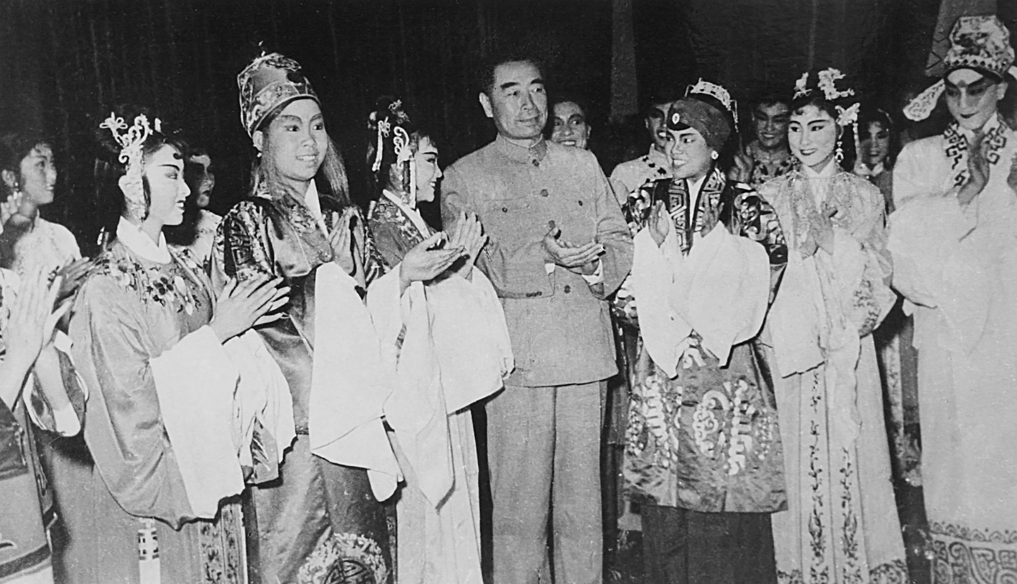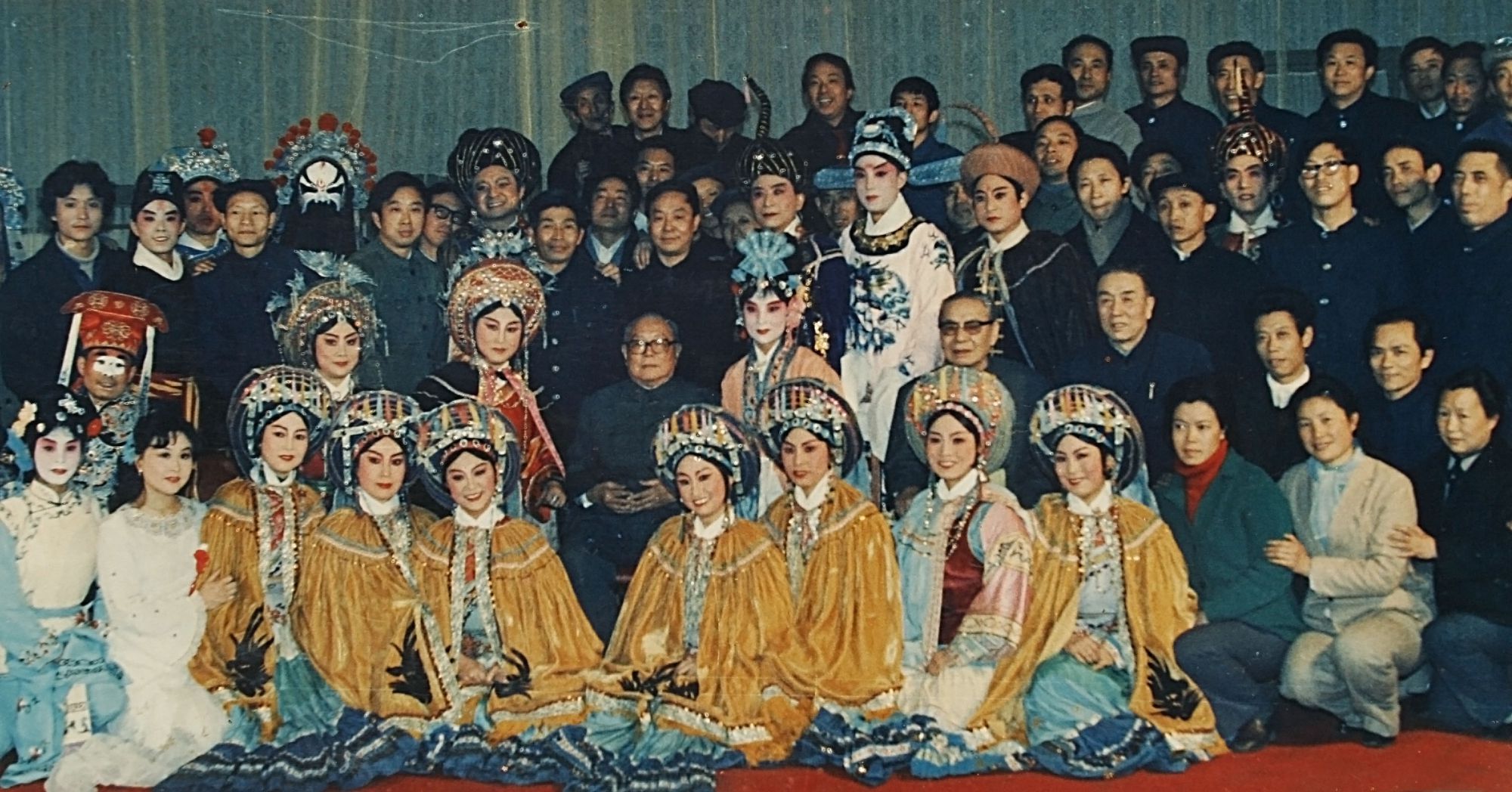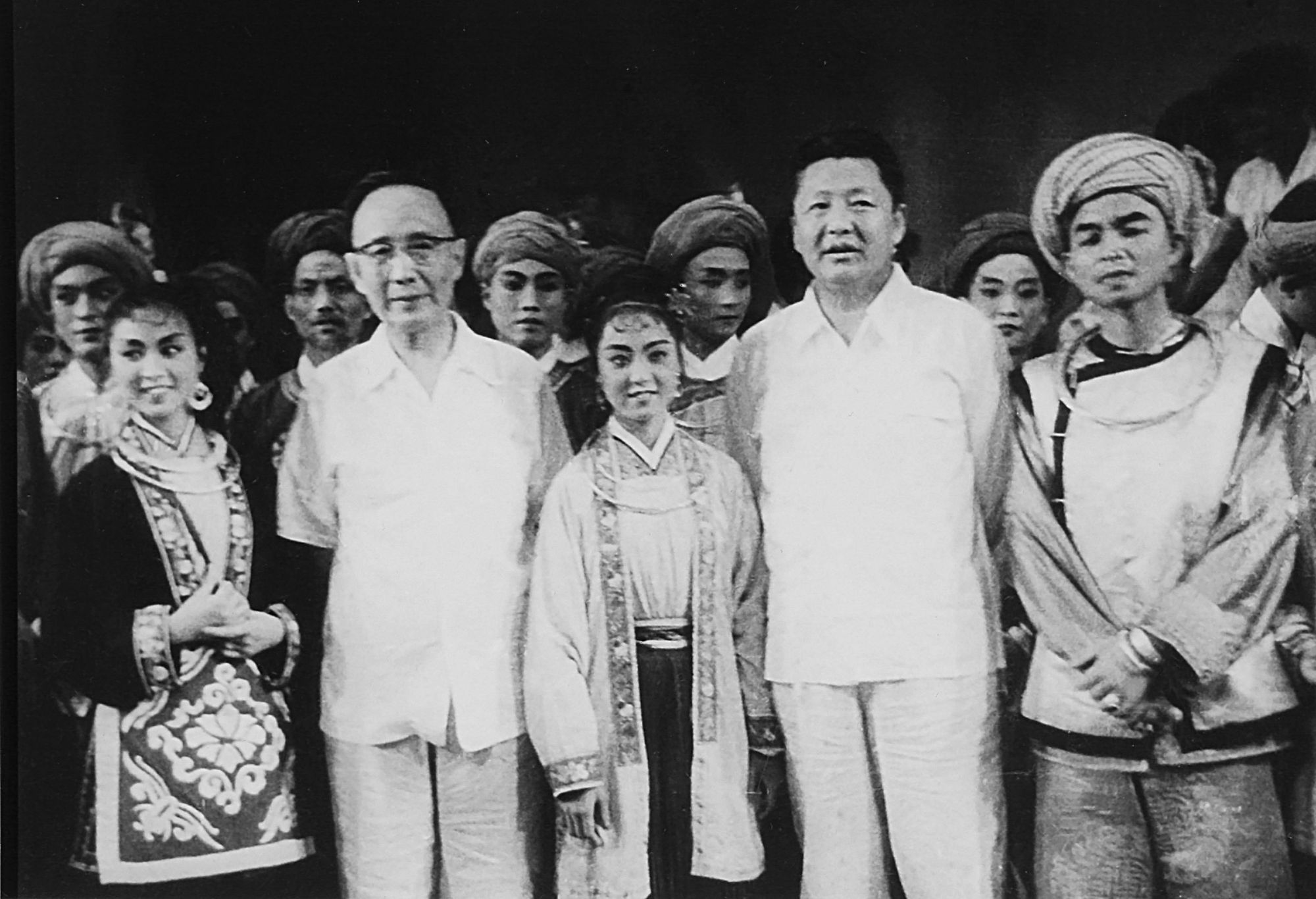 1960年5月2日,周恩來總理接見《卓文君·閨怨》、《西廂記·佳期拷紅》 全體演員并合影留念。 | 1960年6月24日,全國人大副委員長郭沫若、國務院副總理習仲勛接見《秦娘美》 演員并合影留念。 |