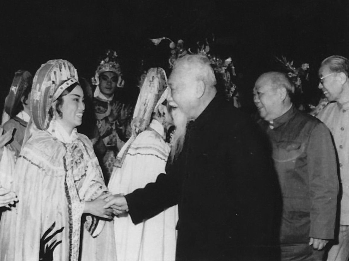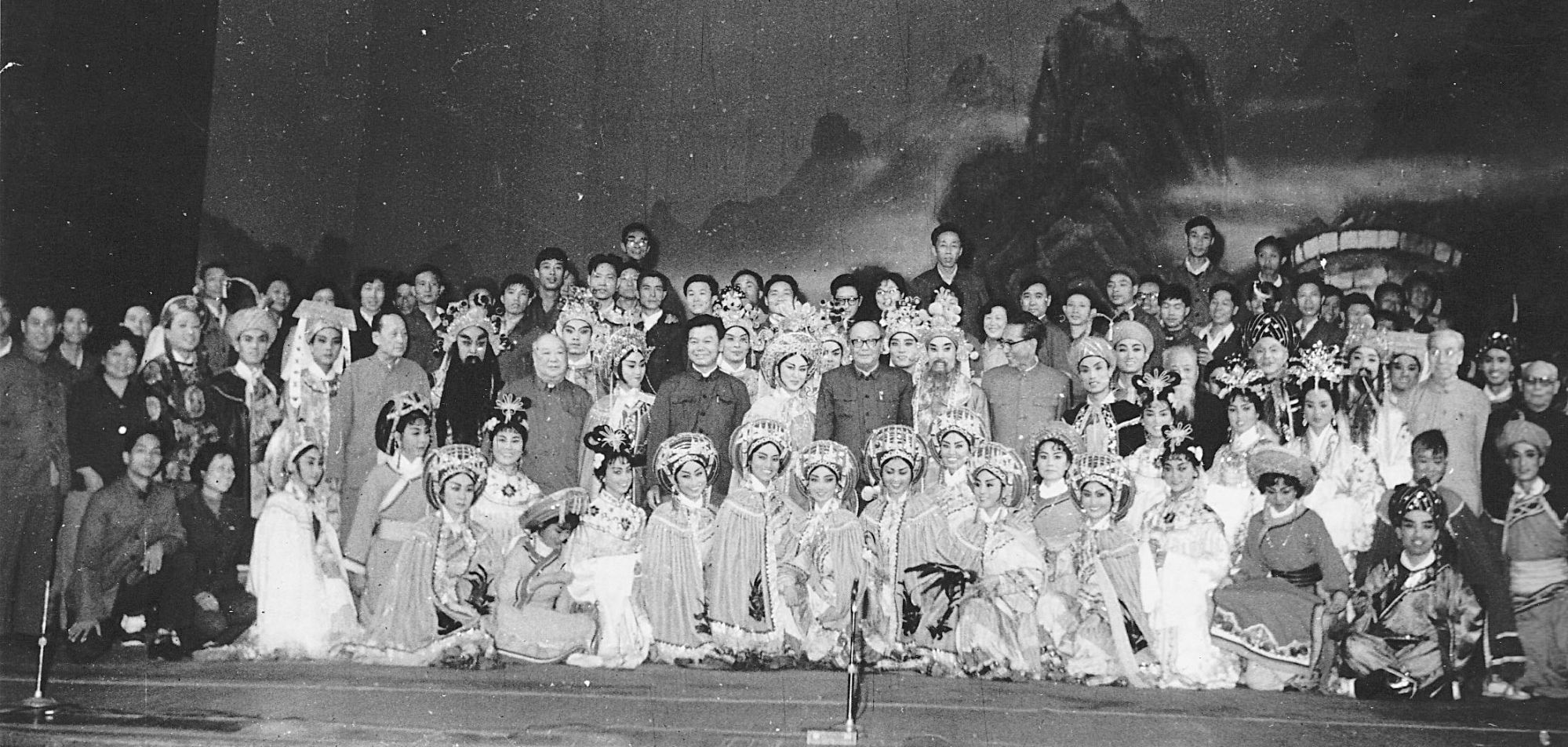 1960年,國務院副總理陳毅、周林省長接見《卓文君》、《紅樓夢》片段的演員, 并合影留念。 | 1960年7月1日,國務院副總理陳毅接見《秦娘美》演員并合影留念。 |
